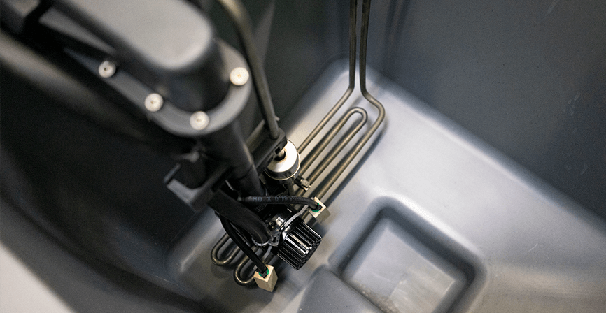 Topná spirála udržuje optimální teplotu mycí lázně na 41 °C, vzduchovací kamínky slouží pro přísun vzduchu mikroorganismům, plovák hlídá minimální hladinu a čerpadlo vhání čisticí médium do průtokového kartáče.